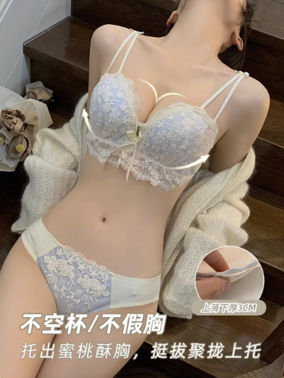 杰丽·莫克小胸聚拢内衣加厚显大纯欲蕾丝少女胸罩上托无钢圈文胸套装送女友 蓝色【单文胸】